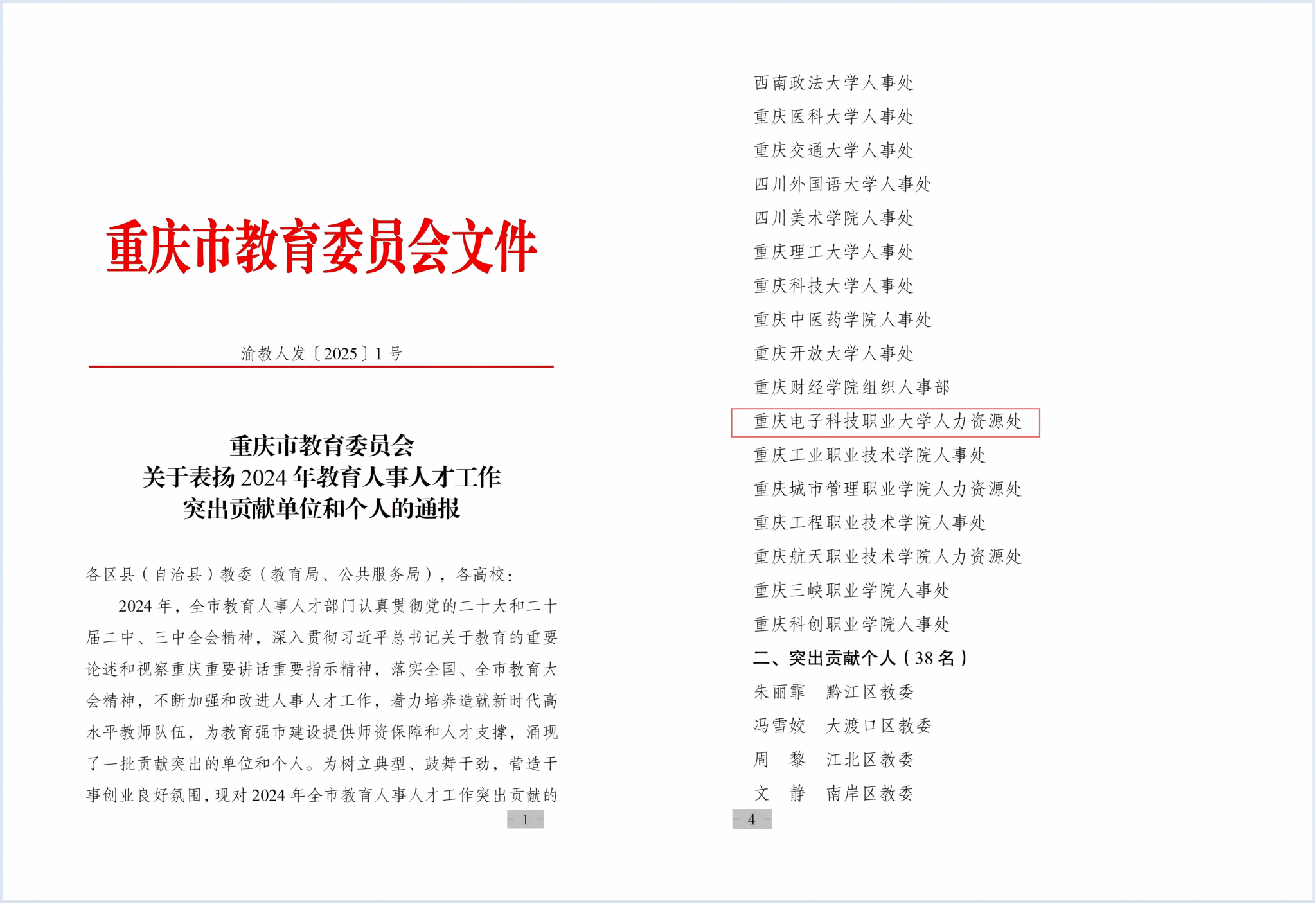 近日,重庆市教育委员会首次发布《关于表扬2024年教育人事人才工作突出贡献单位和个人的通报》,学校人力资源处荣获教育人事人才工作突出贡献单位。这是继2024年度沙坪坝区人力社保工作先进单位后学校获得的又一殊荣。