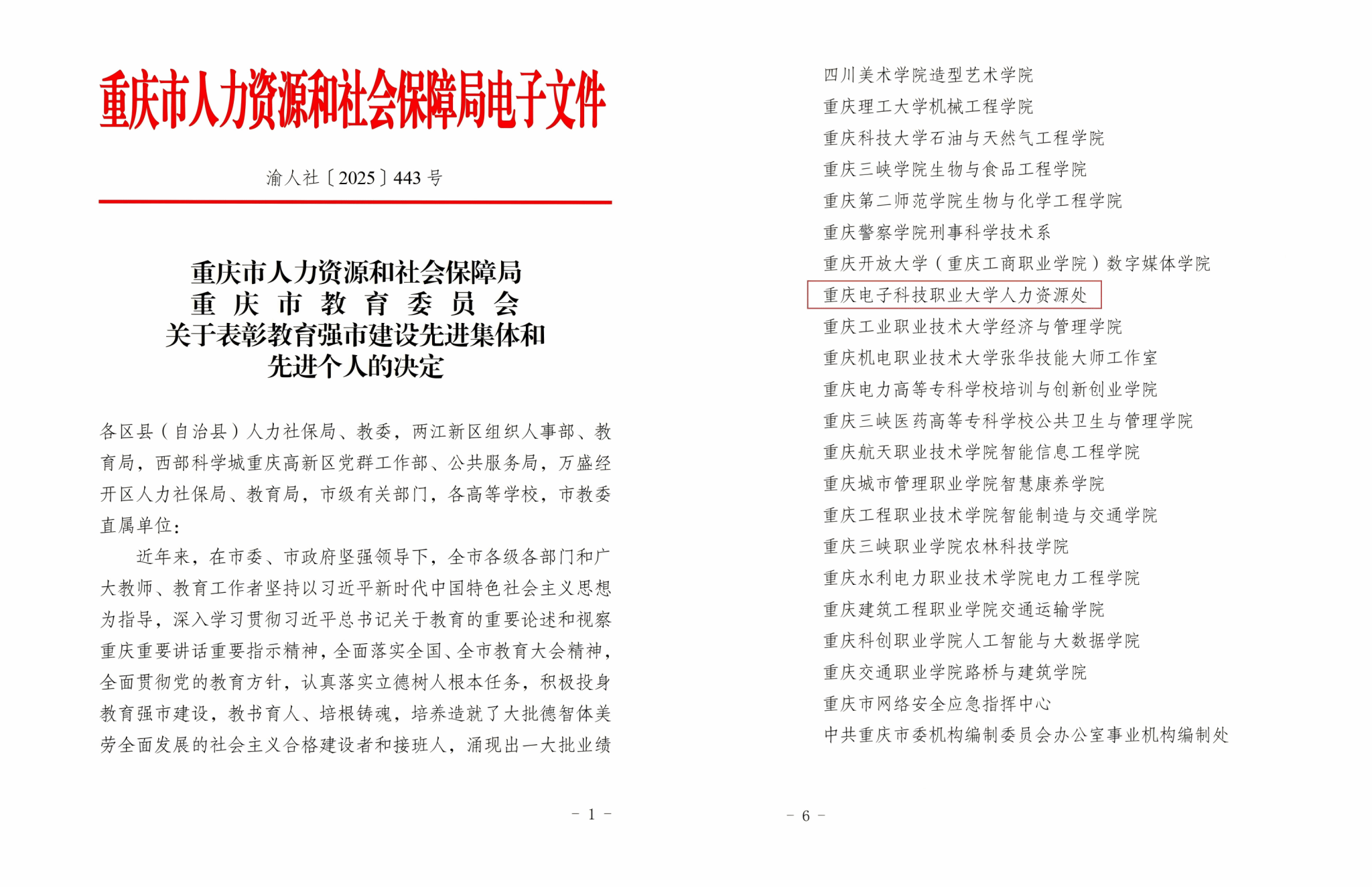 为大力弘扬教育家精神,营造全社会尊师重教浓厚氛围,重庆市人力社保局、重庆市教委启动了“教育强市建设先进集体和个人”表彰评选,经多轮评选,学校人力资源处成功入选教育强市建设先进集体,也是本轮入选高校集体中惟一的职能部门。