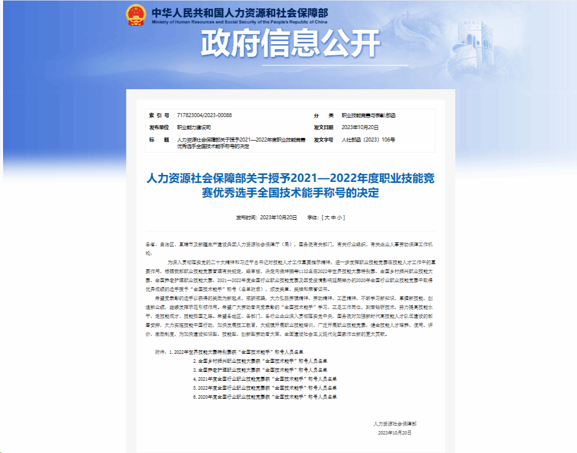 近日,人力资源社会保障部印发《关于授予2021—2022年度职业技能竞赛优秀选手全国技术能手称号的决定》,对2021—2022年度全国行业职业技能竞赛及因受疫情影响延期举办的2020年全国行业职业技能竞赛中取得优异成绩的选手授予了“全国技术能手”称号,我校13名教师入选(名单如下)。
