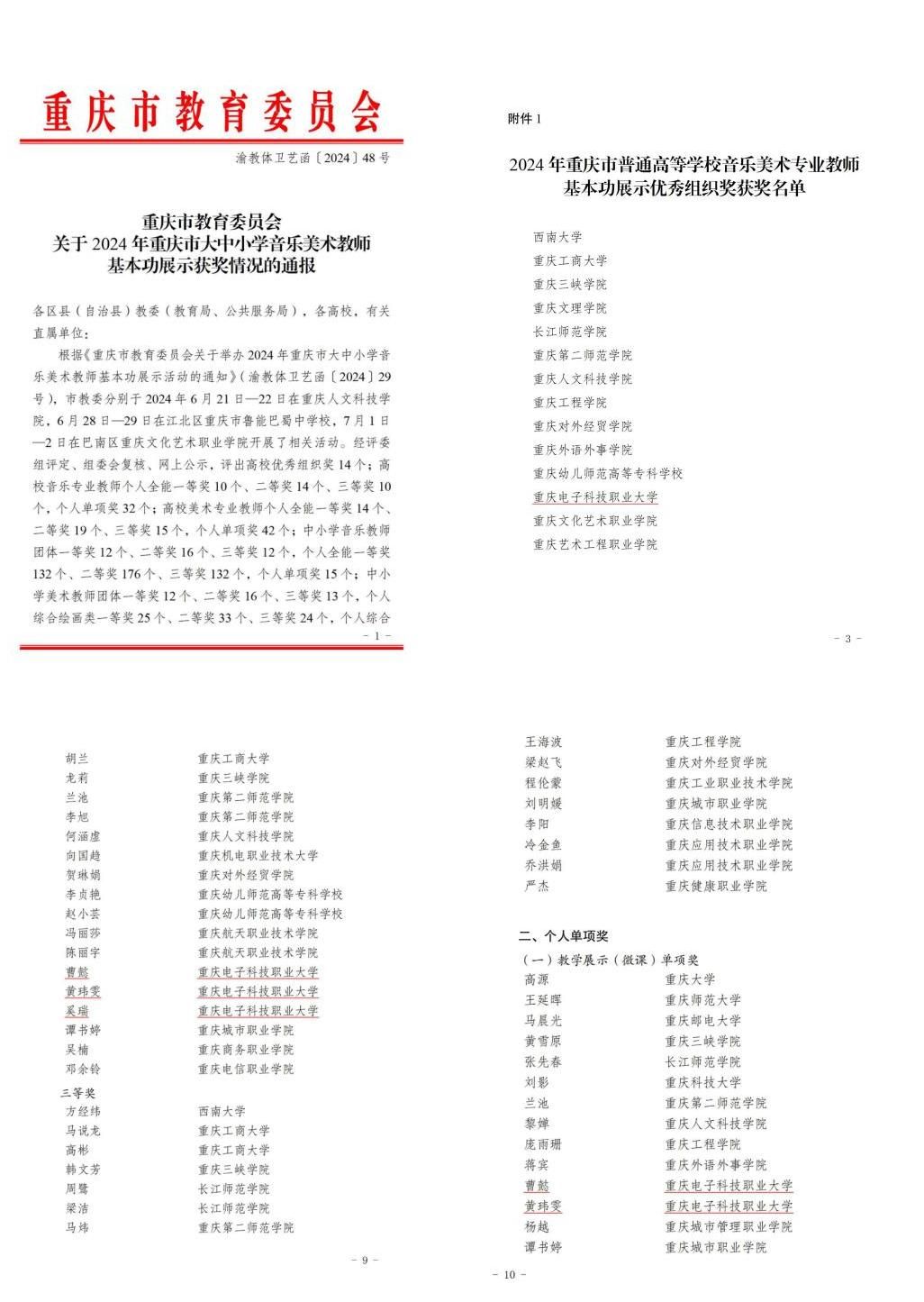 近日,重庆市教育委员会公布了2024年重庆市大中小学音乐美术教师基本功展示获奖名单。我校数字媒体学院曹懿、黄玮雯、奚瑞获全能赛项二等奖,曹懿、黄玮雯另获微课单项二等奖,学校获得优秀组织奖!