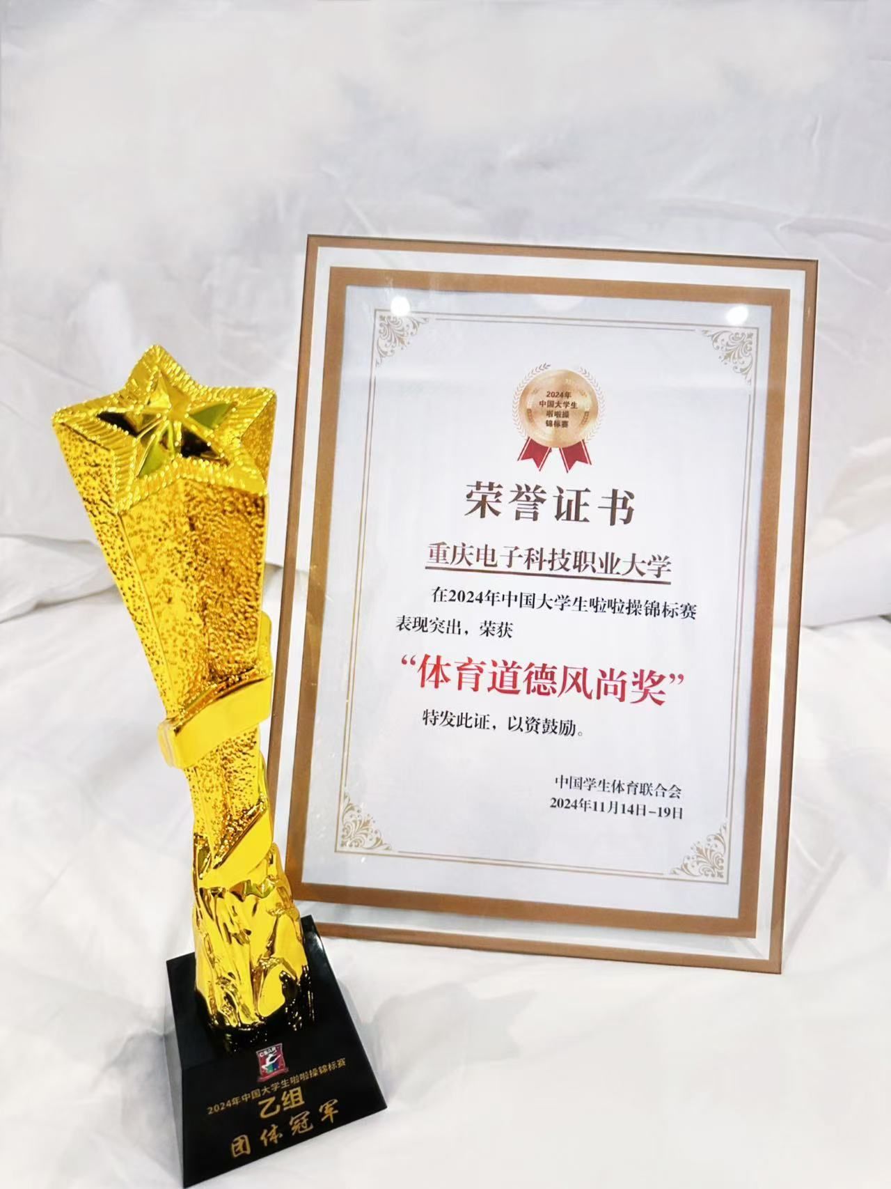 经过4天激烈而精彩的角逐,我校啦啦操代表队16名队员在领队彭天娥老师以及教练员周盈含、曹露双的带领下,获得了团体总冠军和9个单项奖,其中,6个单项冠军,1项第四名和2项第五名的好成绩。同时,学校被中国学生体育联合会授予“体育道德风尚奖”。