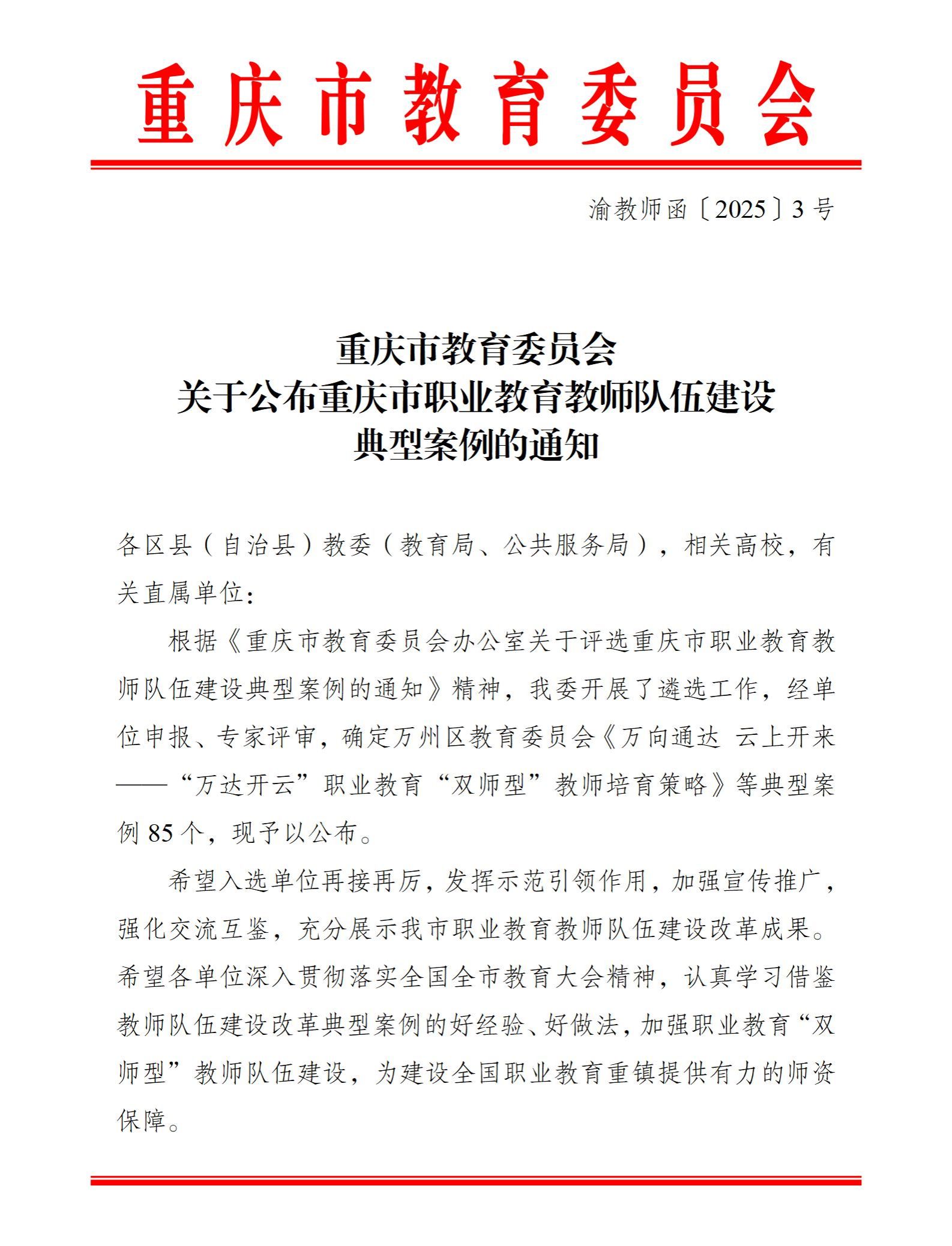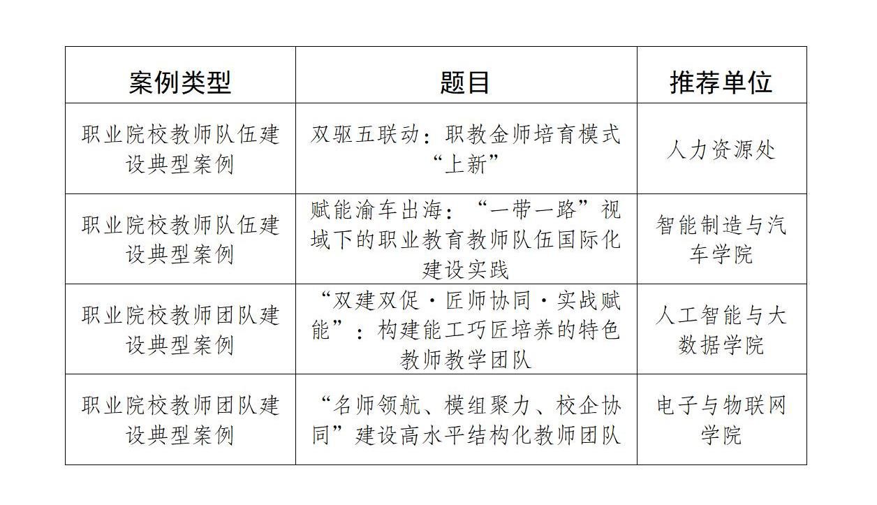 近日,重庆市教育委员会公布了重庆市职业教育教师队伍建设典型案例名单,学校4项案例成功入选,具体如下。