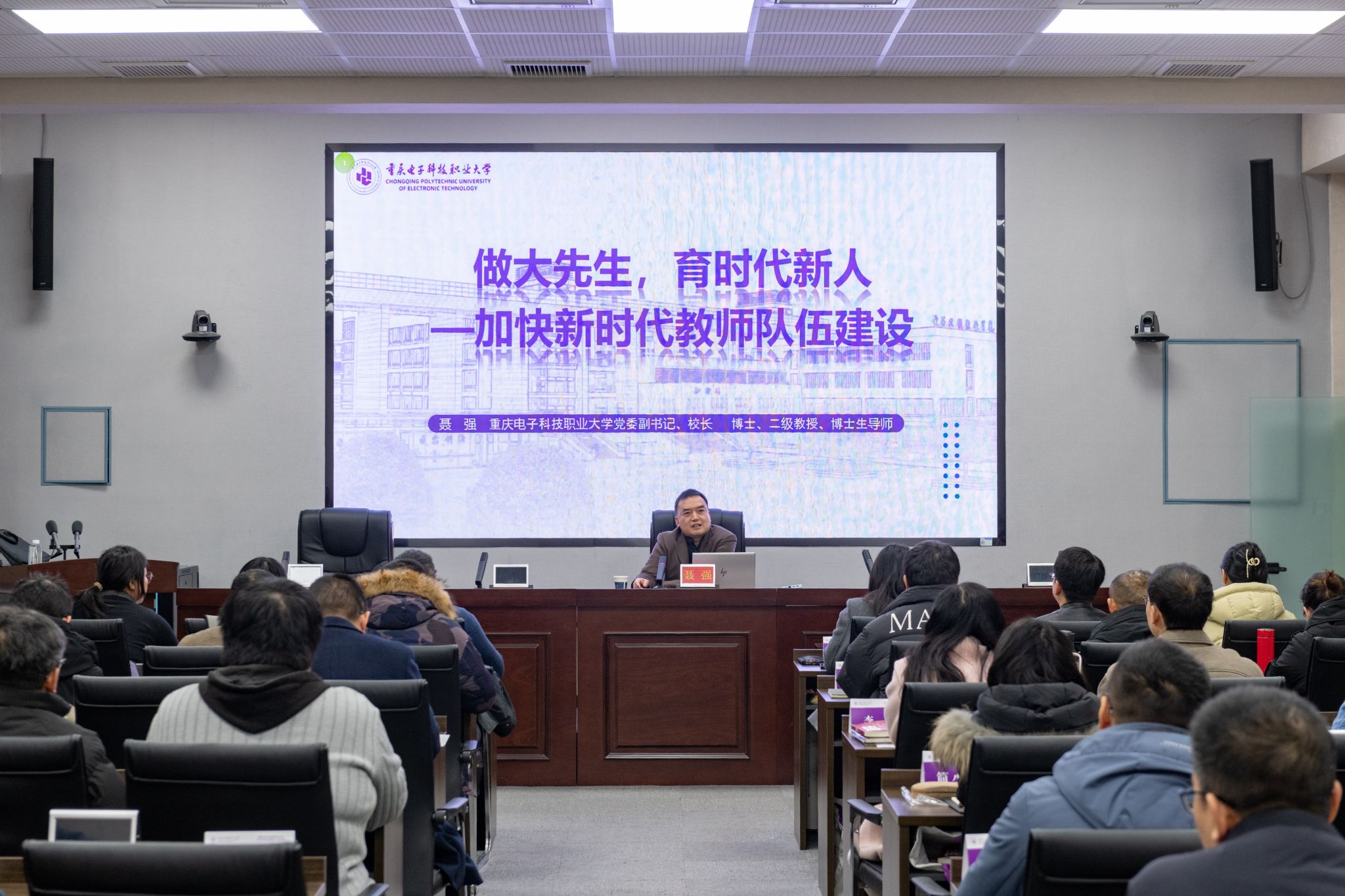 在上午的校长第一课中,聂强校长以“做大先生,育时代新人”为主题,与教师们分享了学校作为国家首批、重庆首所本科层次职业大学的发展历程。他指出,新时代对教师提出了新要求,培养人才需实现教学与生产的有机融合。课堂上,他讲明了高职教师专业发展的新定位,深入浅出地解读了职业师资教育相关政策,从教学、科研、社会服务三方面为青年双师型职业教师的发展指明了路径,使教师们对行业发展有了更清晰的认识。同时,聂强校长勉励教师们成为研究者、学习者、合作者,努力成为“三师合一”的优秀教师,寄语大家志存高远,争做新时代的大先生。