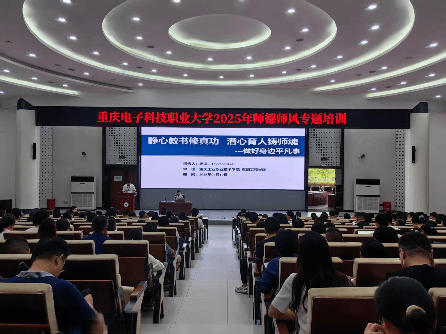大力弘扬培育教育家精神,全面加强师德师风建设,619日,重庆电子科技职业大学2025年度教师综合素养提升——师德师风专题培训在博远举行学校党委教师工作委员会成员、职能部门和教师代表近270人参会。党委常委、党委教师工作部部长、人力资源处处长周鑫主持。