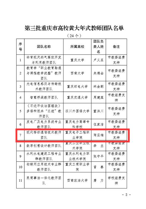 创建黄大年式教师团队是贯彻落实习近平总书记给全国黄大年式教师团队代表回信精神、引导广大教师持续向黄大年同志学习、发挥优秀教学科研团队典型示范引领作用、建设高素质创新型教师队伍的重要途径。现代移动通信技术教师团队的成功入选,是学校持续弘扬优秀师德师风,推进“榜样计划”,努力打造高水平双师教师队伍取得的又一成果。目前,学校已有全国高校黄大年式教师团队1个、市级3个、校级6个。