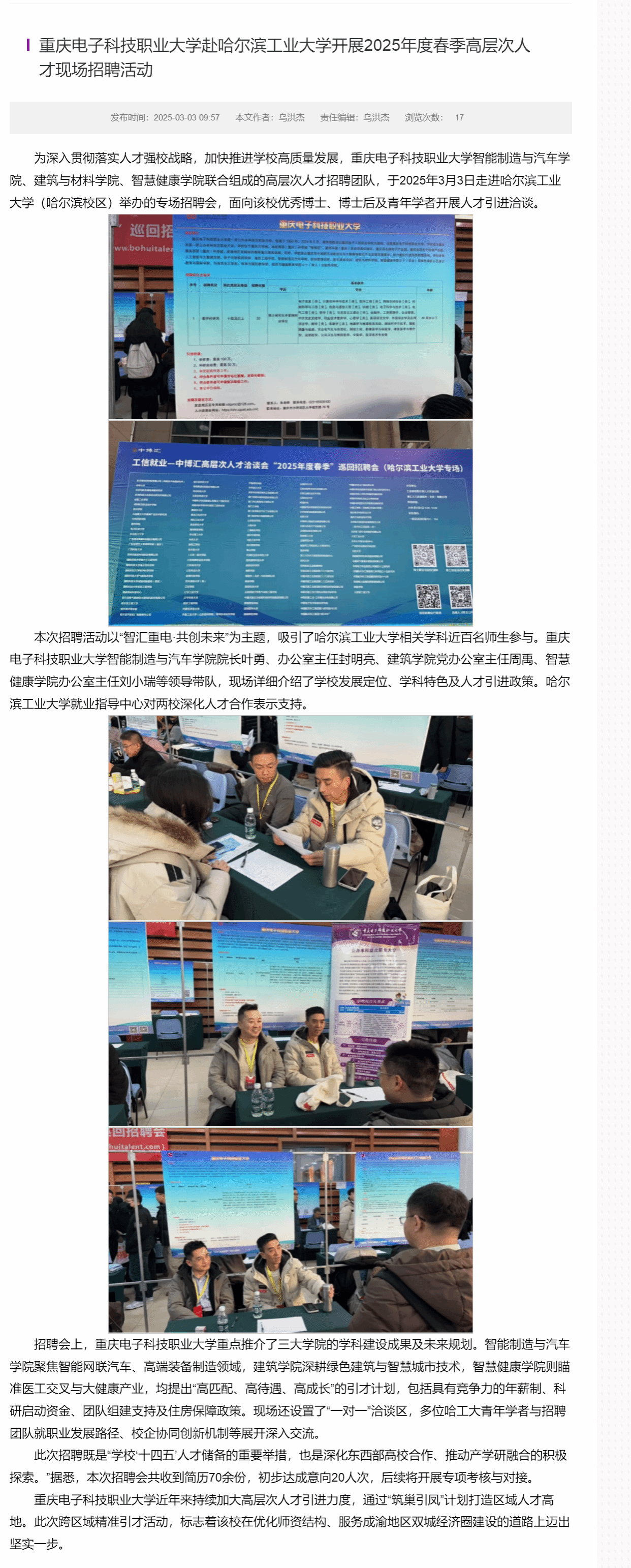 重庆电子科技职业大学赴哈尔滨工业大学开展2025年度春季高层次人才现场招聘活动